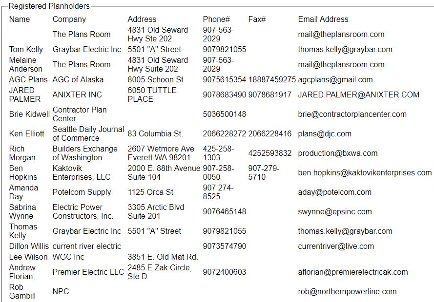 ITB 15102 Egegik Electrical Dist Upgrade.pdf 15102 Addn 1 EEDU.pdf Addendum 2 Final.pdf Bid Schedule.xlsx Pre-bid attendees.pdf Addendum 3.pdf ITB 15102 Bid Abstract.pdf |