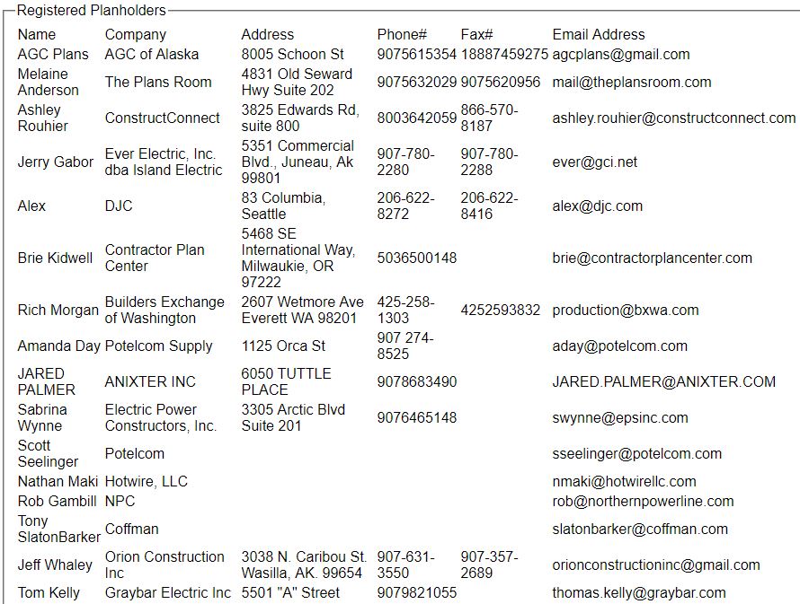 ITB 15102 Egegik Electrical Dist Upgrade.pdf 15102 Addn 1 EEDU.pdf Addendum 2 Final.pdf Bid Schedule.xlsx Pre-bid attendees.pdf Addendum 3.pdf ITB 15102 Bid Abstract.pdf |